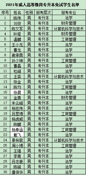 经学生本人申请,招毕办结合《湖北省成人高校招生免试及照顾加分录取项目》中的申请免试条件规定已完成资格审核,现对申请免试就读成人高校专科起点本科层次专业的30名学生进行公示,详细情况见附件。