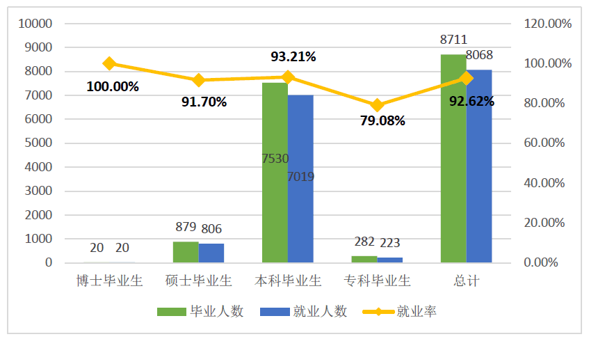 截至2018年8月31日,2018届8711名毕业生中,已就业人数8068人,就业率为截至2018年8月31日,2018届8711名毕业生中,已就业人数8068人,就业率为92.62%,可以看出2018届毕业生就业情况较好。分学历层次来看,博士毕业生的就业率为100.00%,硕士毕业生的就业率为91.70%,本科毕业生就业率为93.21%,专科毕业生就业率为79.08%。