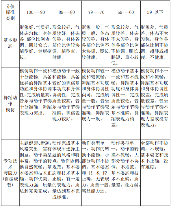 柔韧类:纵横劈叉、前或侧或后搬腿、前或后软翻、后桥每组考生临考前试听考评委提供的音乐一遍,随后集体完成(个人舞蹈秀)