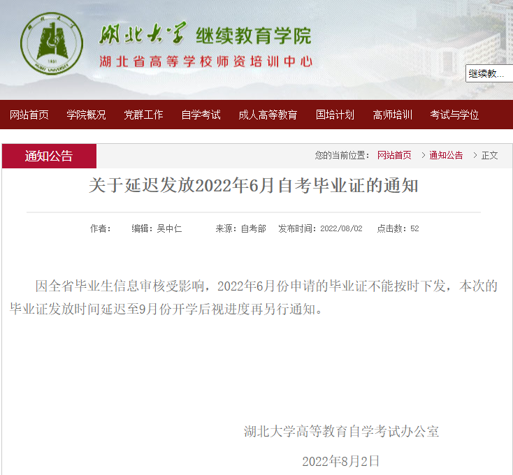 湖北大学延迟发放2022年6月自考毕业证通知已经公布了,下面我们就一起来看看吧!